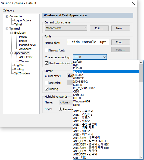 secureCRT 터미널 프로그램 사용하여 리눅스 접속시 한글이 깨지는 현상이 발생하였다.